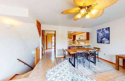 The ocean beach is 0.3 miles down the road from this two-story townhome half a mile from downtown Duck. Not only will you be able to stroll to the sand each morning, but you\'ll also have a neighborhood swimming pool and tennis courts to keep you entertained in the afternoons. This townhouse enjoys a fantastic location in Duck - about half a mile south of downtown, where you\'ll find the Duck Town Park Boardwalk, Duck Donuts, and a number of other restaurants, shops, and conveniences. No matter how you choose to spend your days, you\'ll delight in coming back to a house that has been newly furnished from top to bottom. The living room is full of sunlight, with sliding glass doors that lead outside to a deck. There\'s also a well-appointed kitchen, a dining area for six, and a balcony adjoining the primary bedroom suite - the perfect place for coffee at sunrise. Central AC will keep you cool all summer, and a washer/dryer is on hand for your swimsuits and towels. COMMUNITY AMENITIES