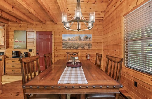 Goldilocks Lodge offers a spacious, thoughtfully designed layout that’s perfect for families, couples, or a group of friends looking for a peaceful Smoky Mountain retreat. The cozy living room features plush seating, a flat-screen TV, and a gas fireplace framed by large windows that bring in beautiful natural light. The fully equipped kitchen has everything you need to cook at home, including a full-sized fridge, stove, microwave, dishwasher, and a breakfast bar with additional seating. Just off the kitchen, the dining area has a large table perfect for gathering over meals or game night.