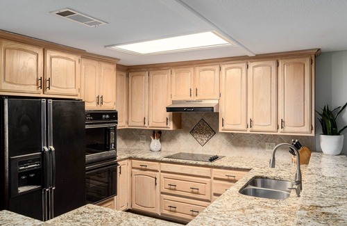Fully stocked with refrigerator, ice maker, stovetop, wall oven, microwave, dishwasher, toaster, coffee maker, and essential cookware.
