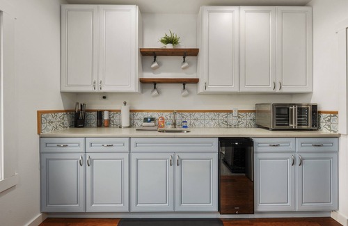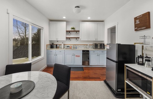 Inside the spacious 1400 square feet of this home, spend an entertaining evening cozied up with a cup of cocoa watching movies or your favorite TV show on the smart TV. Need to log some hours for work during your stay? No problem! This second-floor duplex has a full remote workstation set up with a desk, chair, and monitor as well as a coffee and tea station to keep you energized. The kitchenette is complete with all the essentials and everything you could need to prepare quick snacks on the go or full-course meals. Find an apartment-sized refrigerator, a microwave, a mini cooktop, and an air fryer toaster oven.