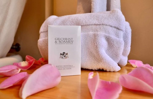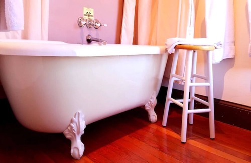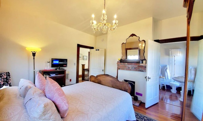 This cozy room is decorated with European walnut antiques, a crystal chandelier, and an original-style fireplace. There is a comfortable queen-size bed, oak floors, and an old-growth redwood trim that has been restored to its natural splendor.