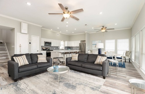 Inside, this contemporary beach house offers all the comforts of home. Cozy sofas, a wall-mounted TV perfect for family movie nights, and a large dining table that easily seats 8 occupy the open living/dining area. There’s also counter seating at the large island in the fully equipped kitchen. Great storage, pots & pans, utensils, etc. - it’s all there waiting for you!