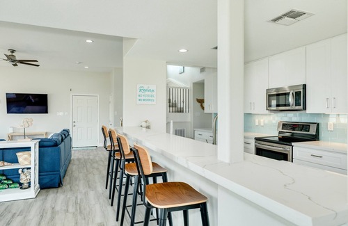 You’ll feel your worries fall away as soon as you step foot into the bright and airy living area, full of comfortable furniture and contemporary style. Come together around the plush sectional for family movie or game nights. Get a glimpse of the Gulf views while catching up over a meal together at the dining table that seats 6 or the breakfast bar that seats 4. The fully-equipped kitchen with abundant storage and stainless steel appliances has plenty of room for everyone to lend a helping hand.