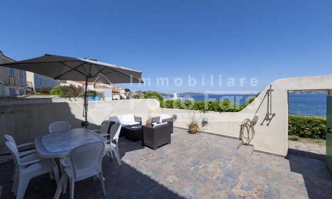 Located in the suggestive residential complex Porto Faro, this four room apartment overlooks the sea. The apartment consists of a living room with fully equipped kitchenette ( gas stove, fridge/freezer combo,oven and dishwasher), one double bedroom with overlooking the sea with ensuite bathroom, two more bedrooms ( single and double plus bathroom ), These rooms face at the back court equipped with utility and laundry room. On the outside, a very large patio fully equipped for meals “al fresco”, deckchairs and gorgeous view on Porto Faro lighthouse and the island of La Maddalena. Suitable for families with direct access to the seaside and to the patio, great for evenings with friends in total relax and privacy. Parking space in private area with remote control gate.