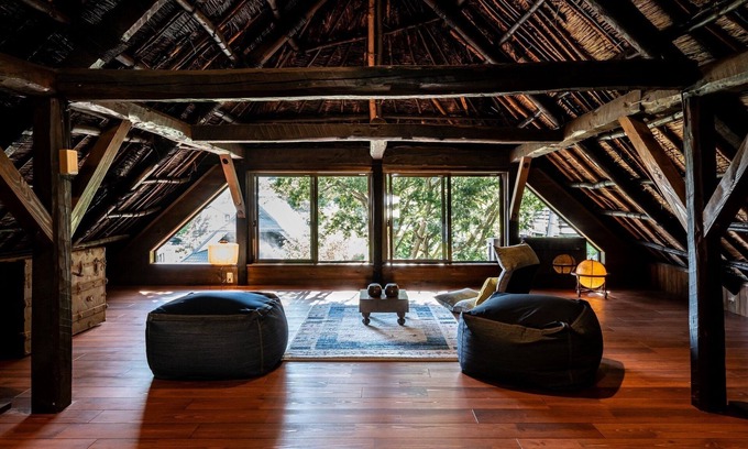 This is a traditional Japanese House Kominka with nearly 100 years of history located in a quiet forest near Lake Saiko This house uses a unique Ashaped sloping thatched roof high quality natural cedar wood and unique construction techniques showing all the beautiful characteristics of early traditional Japanese architecture In 2022 we carried out a partial restoration hoping to preserve its beloved and historic architecture as possible and to add basic facilities and comfort / This traditional Japanese house Kominka has 2 floors and a courtyard The first floor is about 126 square meters the second floor is about 69 square meters and the courtyard is about 150 square meters A semiopen bath is behind the building