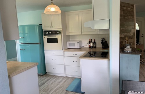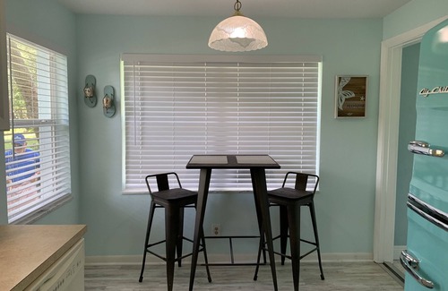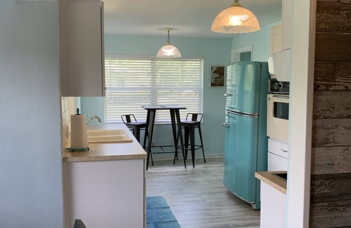 Each bedroom is nicely sized and the house sleeps up to 10 comfortably. The eat-in kitchen with vintage refrigerator has plenty of room and is fully equipped for any cook to prepare their fresh catch of the day. The cool blues on the walls complemented by the warm earth tones mimic the natural surroundings and have you feeling serenity and complete relaxation whether you are inside or out.