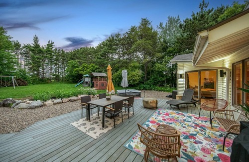 This spacious and serene oasis is located just 5 min from the downtown area with shopping and good eats and 3 min to the nearest boat launch on the St Croix. It’s close to all the action, but off the beaten path. Features 5 bedrooms, 4 full bathrooms, a fully stocked and updated kitchen, an amazing backyard space complete with a hot tub, fire pit, smoker, and it even has a playroom for the kids. This place really has something for everyone! Best part is you're on 3 acres of secluded woods.