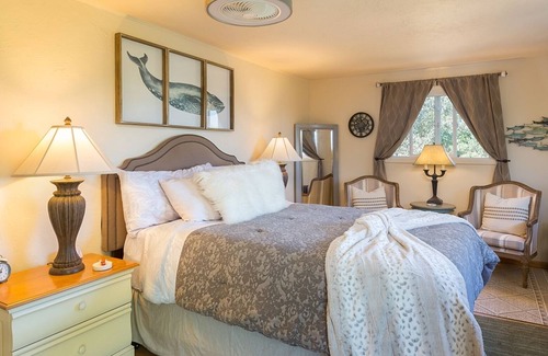 The 3 apartments each have a separate and unique entrance. “Wild Rose” is the largest apartment. Just 2 bedrooms, but there's also an office, a TV room and a proper living room. There's casual dining in the large kitchen, PLUS there is a formal dining room. The patio is private, with plenty of seating. Wild Rose is a newly remodeled apartment with style and comfort in mind. It has a well-equipped kitchen for all your cooking needs and air conditioning to help in the rare warmish days of summer.