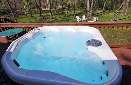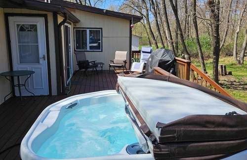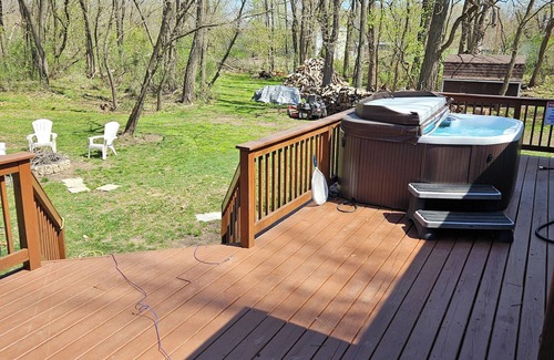 There is a small deck in the front of the home with a wheel chair accessible ramp and a larger deck in the back with a 4 person hot tub. A propane grill is also provided for use. There is a fire pit in the backyard and plenty of firewood to burn. Firewood is provided. If you have a dog, please inform us before hand. There is a $75 fee included with expected clean up after your pet. There is a fine if you do not inform us of your pet!