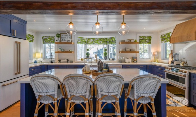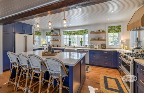 This Bermudian inspired kitchen comes fully equipped with high end appliances, a farmhouse sink, and large island with seating for 4.