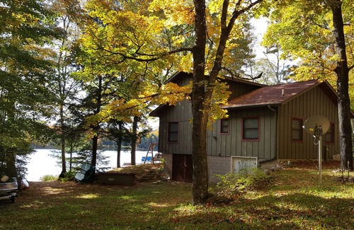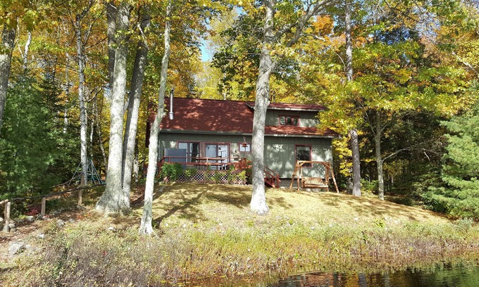 Great Room with kitchen, loft sleeps 4 or 5, and 3 queen bdrms, deck, fire ring, W/D with fee, refrig, 18 ft GRUMMAN canoe, 2-person kayak just perfect for lake and channel, pier, swim raft, nice big paddle board, Lily pad, 55 acre lake, fish from dock, fishing rowboat or pay for motor gas use, only 4 other cabins on lake, serene, pristine, deep in woods, 5 mi from Lac du Flambeau, Wi. 20 mins to Boulder Junction bike trails. Dishwasher, microwave, children's swing set, adult wood swing, beautiful location overlooking lake, deck table/chairs, loons, hummingbirds, bear, deer, racoons, eagles, quiet so you can hear yourself think, re-built in '08.
