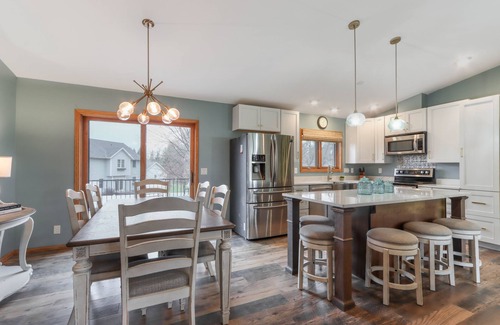 Three bed, 3 bath home + office in executive neighborhood close to Marshfield Clinic, UW & trails. New white kitchen w quartz counters, oversized cherry island & SS appliances that opens to vaulted family room w 55” smart tv & gas fireplace. Primary suite features new bath & walk in closet. 2nd bedroom w double bed & 2 twins w new bath. 3rd bedroom w queen & new full bath. ***Will trade out new queen bed in bunk room if requested. Will add TVs to each bedroom upon request**** New paint, new flooring. Private office! Lower family room w smart tv, bar and air hockey. Wi-Fi. Furnished +Deck, grill. NEW LANDSCAPING & CENTRAL AIR) We have a 10-person pontoon boat, a fishing boat, 5 kayaks and 4 person UTV that can be rented separately 20 minutes away.