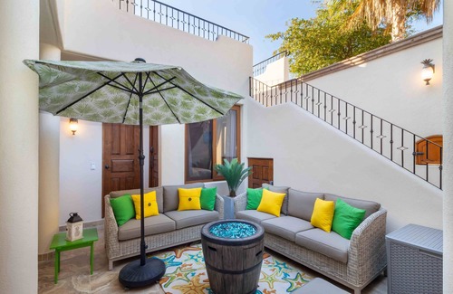 From the dining room table/chairs, living room sofa, cocktail table, large entertainment center and computer desk in study area to all 3 bedroom sets with massive beds, multi-drawer dressers, side tables and elegant armoires to hold all your vacation clothing! This casa features multiple private patio areas...a huge central courtyard with faux wicker sofa/loveseat/firepit greets you as you enter the home, a large garden patio off the dining room, large second floor terrace with covered pergola and open deck lounging space, plus a 3rdfloor viewing tower with 360 views to the gorgeous Sierra Giganta mountains and the pristine Sea of Cortez. One large Master suite with California King bed, secondary bedroom with Queen bed, and a full guest bath are located on the ground level, with a second Master suite with California King bed is located on the second floor!