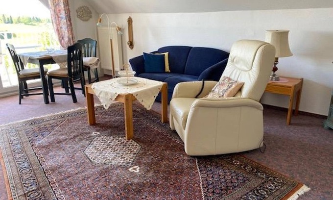 Living room with upscale amenities, sofa bed, flat screen TV, radio, W-Lan and balcony with panoramic views, garden use kitchen with 2 plate stove, microwave, refrigerator with freezer, coffee filter machine and Nespresso machine, crockery and cutleryBathroom with shower & WCSchlafzimmer with 1 double bed + 1 single bed, exit to second Balcony special features: - 2 balconies - landscaped garden - W-Lan use - parking space in front of the house