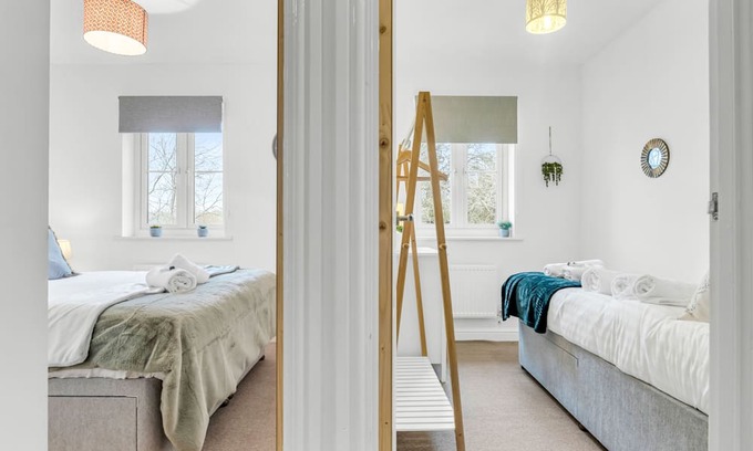 Lark Rise Lodge is located in a quiet residential area of Brackley within a short drive to all main transport links (with A422 and A43 being only a short drive away) and within walking distance to local amenities, including selection of shops, restaurants, and a fitness centre. The house comes fully furnished and equipped, with bills and housekeeping included in the price for longer stays. It is an ideal option for anybody relocating or working in the area. The flexible set-up allows our guests to choose between having king-size or single beds in the double bedrooms.