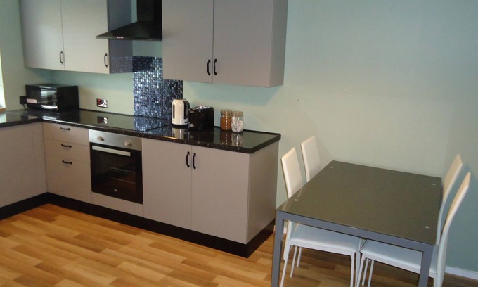 The accommodation comprises 3 bedrooms, a dining room/kitchen, living room and bathroom and a rear garden. All rooms have their own desks. Bedding and towels are included. The house benefits from unlimited WIFI. There is a 4K TV with ATMOS sound bar and the kitchen contains all the usual cutlery and plates, pans, cups etc. There is a cooker, kettle, microwave, washing machine and tumble drier.