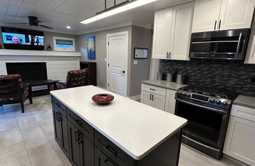 The interior of this modern craftsman style house includes a fully stocked kitchen , coffee bar, fully stocked bathroom , 2 seating areas and 5 total smart TVs .