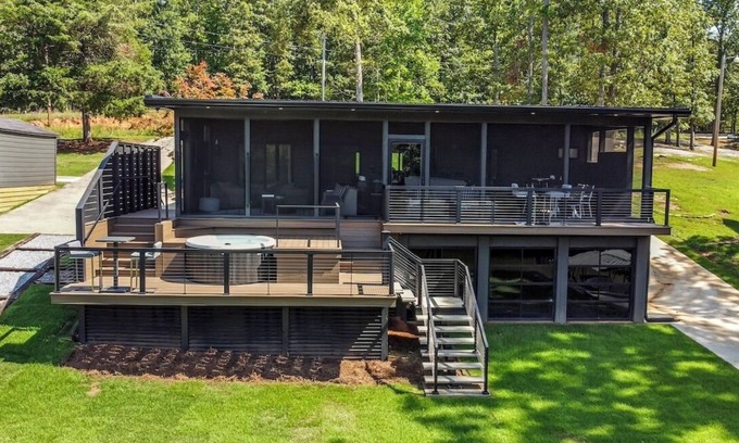 New, modern lakefront retreat with screened porches, two balconies, private dock, hot tub, paddle-boards, kayaks, and peaceful cove views. Indulgent but not pretentious—perfect for couples, families, or friends who appreciate beauty, intention, and elevated living. A tilt-mounted porch TV lets you watch from the hot tub or sofa, with an ice chest nearby to keep drinks cold. Optional kitchen pre-stocking and private chef available. Everywhere you look, there’s a detail designed with you in mind.