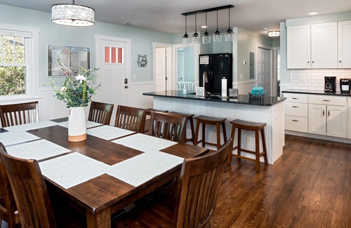 The big dining table seats 8 and the island has seating for 4. Large living room with flat screen TV & sectional. The master bedroom has a king bed & a private bathroom. The bunk room & bath can accommodate 4 youth with ample storage. The guest bedroom and bath can easily accommodate 2 people. There is a pack-n-play, baby gate & booster seat provided.