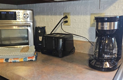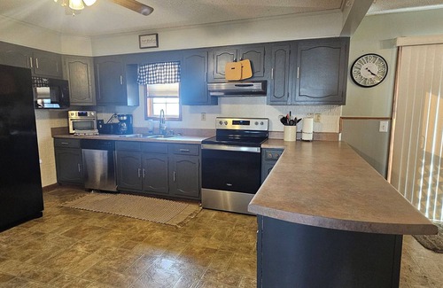 furniture. The living room includes a cozy sofa bed for additional sleeping space and plenty of seating for large groups. Enjoy the wonderful amenities such as a 2-car garage, covered carport for your boat or off-road vehicle, plenty of parking in the rear of home and the front, firepit with seating (firewood included), fenced yard, gas (propane) grill (tank provided), stone fireplace, and a great location for boat launching, fishing, and water sports. The kitchen is well stocked for all your cooking needs, plenty of utensils/pots/pans/plates/cups, coffee pot, electric can opener and air fryer included. Full size washer and dryer, central heat/air, and gas fireplace are some additional features. Each room is equipped with a ceiling fan for some extra added comfort. Bedding and towels are provided along with some laundry detergent so you can wash and refresh your linens for extended stays. Play a game of checkers on the back porch while watching the sunrise or sunset or grab a friend and play a game of electronic darts in the garage area. This home is accomadating and spacious for families or large groups. Paris Landing State park is 6 miles, Port Rd. public boat ramp is 2.5 miles, Sunset Bay boat launch is less than 1/2 mile (must pay to launch @Sunset Bay), 4 Way grille 3.5 miles, Blues Landing is 5.6 miles and so many more options. This home has 2 driveways one in the front and one in the back located on a corner lot. We look forward to hosting you at our place.