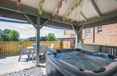 Bedroom 3: With twin beds and en-suite with shower cubicle and toilet.. Oil central heating, electricity, bed linen, towels and Wi-Fi included. Initial fuel for wood burner included. Welcome pack. Enclosed front garden with, sitting out area and garden furniture. Hot tub for 6 (private). Private parking for 3 cars. No smoking. Please note: There are 2 steps in the garden.. Welcome to Mossknowe Escape, your ultimate luxury retreat nestled on the edge of the charming village of Kirkpatrick Fleming in the heart of Dumfries & Galloway, Mossknowe Escape offers a sanctuary of luxury and tranquillity. This exquisite annex is part of the grand Georgian Mossknowe House, set within beautifully landscaped grounds. A stay here promises the perfect blend of elegance, comfort, and privacy, making it the ideal destination for a memorable holiday.
