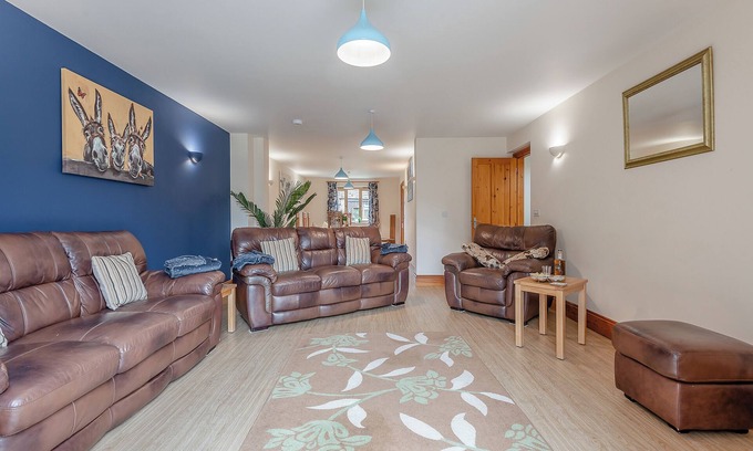 Bedroom 3: 2 x Single (3ft) Beds Ensuite: Cubicle Shower, Heated Towel Rail, Toilet. Underfloor electric central heating, electricity, bed linen, towels and Wi-Fi included. 2 travel cots and 2 highchairs available on request. Welcome pack. External games room: With pool table, snooker table, table football and a selection of games (shared with other properties on-site). Lawned grounds with patio, sitting-out area and garden furniture (shared with other properties on-site). Hot tub for 6 (private). Sauna (shared with other properties on-site). Indoor heated swimming pool (shared with other properties on-site, 12.5m x 6m, depth 1m x 1.5m) with shower and changing facilities. Badminton court (shared with other properties on-site). Children’s play area (shared with other properties on-site). Fishing on-site (free of charge). Electric car charging point. Private parking for 2 cars; additional private on-site car park. No smoking. Please note: There are 3 unfenced lakes in the grounds. This property is situated on a working farm.. This picturesque semi detached rural cottage, sleeps seven within three en-suite bedrooms.
