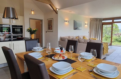 This fabulous home, set all on one floor, has an open plan lounge, dining and kitchen area with vaulted ceiling and huge floor to ceiling windows that let in the light, and look over the garden to the fields beyond. Speakers in the ceiling, connected to Spotify, allow you to play music throughout the living areas, while statement and mood lighting gives an ambience for any time of day. The high-end kitchen is fully equipped with American fridge/freezer, wine cooler, double ovens, steam oven, microwave, induction hob, washing machine and tumble dryer. A wonderful island opens the kitchen up to the dining area, with large dining table, which leads to the lounge area with large L shape sofa, Smart TV and gorgeous views. The master bedroom has a kingsize bed with en-suite shower room, bedroom two has a double bed, and bedroom three has a kingsize bed which can be turned into twins, giving you flexible sleeping arrangements depending on your party. The main bathroom has a shower over the bath.