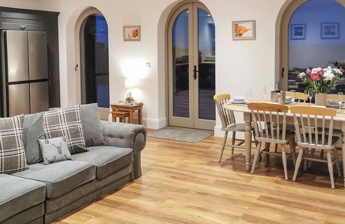 Back at Archers Barn, the property itself boasts a contemporary design and high-quality furnishings. The open-plan living space features a stylish, dark blue shaker-style kitchen with oak worktops, complemented by large arched windows and patio doors that flood the area with natural light. The dining and living areas open onto a courtyard, providing a perfect spot to relax and take in views of the countryside. A large L-shaped sofa invites you to unwind while watching your favourite movie after a day of exploration.