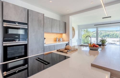 Shower Room: Cubicle Shower, Toilet. Oil central heating, electricity, bed linen, towels and Wi-Fi included. Initial fuel for wood burner included, remainder available locally. Welcome pack. Front garden with sitting-out area, balcony and garden furniture. Bike store. Private parking for 3 cars. 1 dog welcome. No smoking. Please Note: The garden is steep and not enclosed, so children and pets need to be supervised.. Welcome to Berkeley, a stunning luxury holiday let nestled in the picturesque coastal village of Kippford in Dumfries and Galloway. Perched in an elevated position, Berkeley offers breathtaking views over the Estuary, seamlessly blending elegance and comfort for an unforgettable stay.