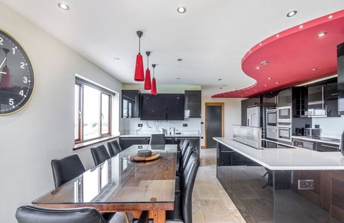 Games Room: Pool Table. Underfloor oil central heating, electricity, bed linen, towels and Wi-Fi included. Cot available. Welcome pack. Back garden with patio and garden furniture. Hot tub for 6 (private). Sauna (private). Private parking for 3 cars. No smoking.. Discover Sir a Wel, a beautiful holiday home tucked away in the tranquil village of Llanerchymedd, Anglesey. Designed for comfort and relaxation, this stylish house sleeps six guests in three spacious king-sized bedrooms, all conveniently located on the ground floor - one featuring its own luxurious ensuite for added privacy. The heart of the house is its bright, open-plan living, kitchen, and dining area - ideal for cooking, feasting, and unwinding together. Upstairs, fun awaits in the dedicated games and cinema room - perfect for movie nights, family tournaments, or rainy-day retreats. Step outside into the private garden where a bubbling hot tub and soothing sauna invite you to soak your cares away under the stars. Sir a Wel warmly welcomes pets too, so your four-legged friends don’t have to miss out on the adventure!