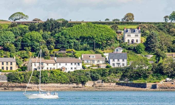 Separate Toilet.. Gas central heating, gas, electricity, bed linen, towels and Wi-Fi included. Travel cot and highchair available on request. Grounds with patio, summerhouse, sitting-out area and garden furniture. Barbecue. Parking for 3 cars. No smoking. Please note: There are 16 steps from the parking area to entrance. There are 22 steep stone steps set over to flights of stairs in the garden.. Set in the ancient waterside village of Llanstadwell looking out over the broad tidal sweep of the waterway. Skillfully designed to maximise the glorious Waterway views, the house is designed with elegant bedrooms on the first floor and an open plan kitchen/dining room and living rooms on the second floor. Beautiful, panoramic views can be enjoyed from the delightful summerhouse, a perfect vantage spot to sit and relax and watch the ever-changing Haven Waterway. Furnished to the highest standards and complimented by the excellent decor - the attention to detail throughout creates a wonderful self-catering cottage. Luxury fitted kitchen, with wine fridge, and a dining area with fantastic views. The elegant lounge has an oil burning stove perfect for cosy nights. Doors from the lounge open into a small study from where there is access across a bridge to the rear lawn. Follow the steep stone steps up from the lawn to the summerhouse.