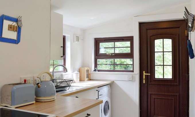 Kitchen: Galley style with electric oven, electric hob, microwave, fridge/freezer and washer/dryer.