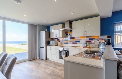 Bedroom 3: 2 x Single (3ft) Beds Ensuite: Cubicle Shower, Toilet. Gas central heating, electricity, bed linen, towels and Wi-Fi included. Initial logs for wood burner. Travel cot and highchair. . Enclosed lawned garden with patio and garden furniture. Balcony. Private parking for 4 cars. No smoking. Please note: There are 2 steps to the entrance.. Take in the breathtaking view from this property, which draw you in like a magnet, where the beach stretches for 5 miles from Filey all the way along to Bempton Cliffs. The sea-facing side of the house is made almost completely of glass, so that you have uninterrupted views. The open-plan living room is heavenly, with the sweeping kitchen, the dining table and the big luxurious corner sofa all enjoying that divine panorama. Whether the waves are crashing vehemently below or tranquilly rippling, it is sure to be mesmerising.