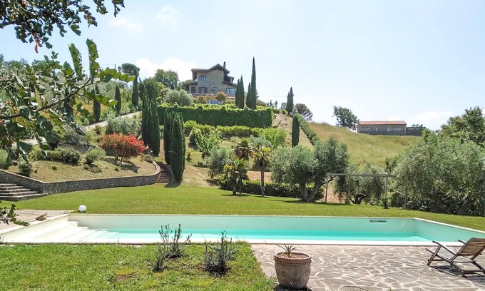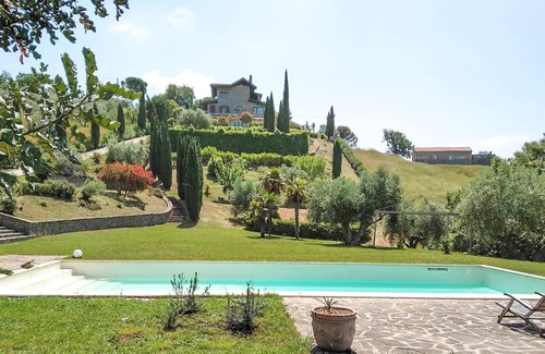 This beautiful vacation home is the ideal for your vacation with your extended family. The house offers you a generous amount of space with many nice rooms for gathering together as well as private areas to retreat. A beautiful balcony surrounds the house and offers you a fantastic view over the countryside. Enjoy the beautiful garden and read a book in the shade of the trees and shrubs. The pool is located below the house, about 200 meters away and offers you plenty of swimming fun.
