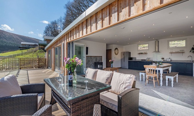 Superb lodge with bi-folding doors with views over the Welsh and English countryside, perfect for a family break or get away with friends.. 12 steps to entrance.