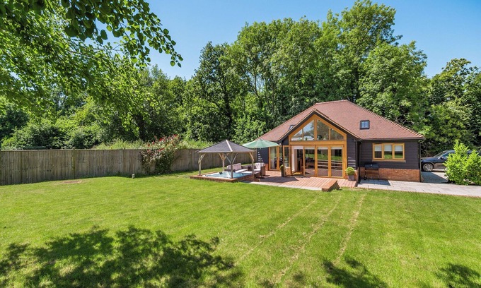 Separate Toilet.. Underfloor central heating, electricity, bed linen, towels and Wi-Fi included. Travel cot available on request. Welcome pack. Back garden with sitting-out area, barbecue and garden furniture. Hot tub for 6 (private). Private parking for 4 cars. No smoking.. Welcome to Chestnut Lodge, your exquisite retreat nestled in the serene village of Sutton Valence, Maidstone.