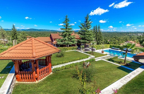 The charming semi-detached house is located in the small village Veli Brgud. Here you will spend a perfect vacation. In the surrounding area there is a beautiful landscape, meadows, forests and the atmosphere of a small town in the countryside. The ground level house is furnished with care and radiates a warm atmosphere. In front of the house is a large covered terrace. The yard is large and houses the pool, the summer kitchen, a romantic gazebo and a play area for children. The mountains off the coast provide a particularly pleasant climate, there are warm summer days and fresh summer nights. In nearby Opatija are beautiful beaches, in the town of Kastav you can experience history and a shopping trip is best done in Rijeka. In this region the restaurants have a very good reputation.