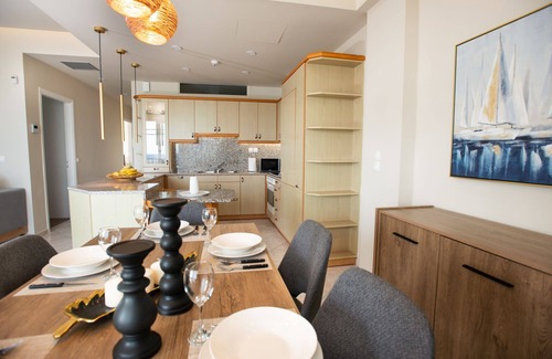The heart of the home is the open-plan kitchen and living area, where culinary delights are crafted and cherished memories are made. The kitchen is fully equipped, including a dishwasher, allowing you to effortlessly whip up delicious meals. As you cook, chat, and dine, the panoramic windows frame stunning vistas of the picturesque harbor and the endless sea beyond, infusing every moment with tranquility and beauty.