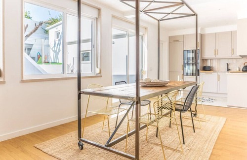 Adjacent to the kitchen, the dining area features a large table perfect for shared meals, remote work sessions, or planning your next day’s adventure. Step outside to a private, sunny patio—an ideal spot for al fresco dining, a morning coffee, or sipping wine as the sun sets over Cacilhas.