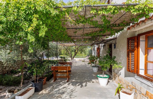 Only about 200 m from the sea, in the popular tourist town of Malinska, you will find this comfortable vacation apartment on the first floor. It is functional, simply furnished and comfortably equipped. Main advantages of this apartment are quiet location and a large number of terraces. The central place during your stay will certainly be a very pleasant shady terrace in front of the apartment, covered with a vine. One of the terraces is designed as a sunbathing area. A barbecue is at your disposal and the garden is fenced. Also experience the nearby pebble and sandy beaches, secluded coves, cuisine with seafood specialties and events with original folklore. Long, beautiful promenades can be reached on foot, you can also enjoy sports bowling, tennis, mini golf, hiking, cycling and water activities.