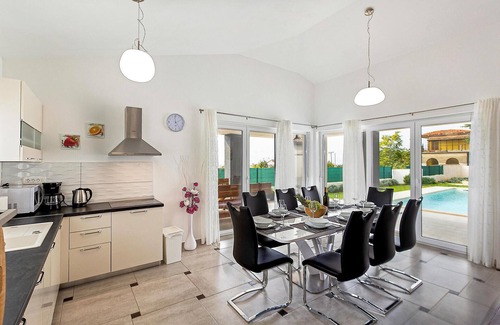 This exceptional holiday home with pool is located in the small village of Smoljanci, between the medieval villages of Svetvinenat and Bale. Escape the summer hustle and bustle and experience a relaxing holiday in this house with its tasteful interior and well-kept outdoor areas. The fenced plot, play equipment for children and summer kitchen are additional plus points. Relax by the large pool and treat yourself to a refreshing dip. Discover the beaches on the beautiful Istrian coast with crystal-clear sea and the romantic holiday destination of Rovinj, which will captivate you with its entertainment and gastronomic delights.