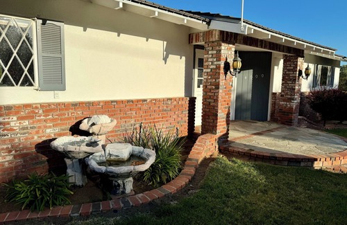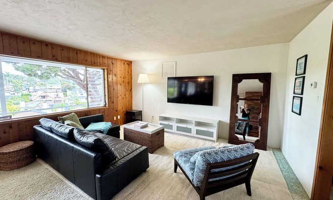 ~1 mile from Tamarack beach. Comes with beach necessities eg, bikes, coolers, umbrella, BBQ, chairs, wagon, surfboards. Has a tropical backyard with organic fruit orchard, BBQ & firepit. Request a movie screen/projector for outdoor movie nights. Legoland is 7min away. Amenities for babies like stroller & pack-and-play. 2-car garage. Connected granny flat is available (bd/1 bth/huge living room) for additional cost. Must rent both to have private yard & private washer/dryer. Peak ocean view.