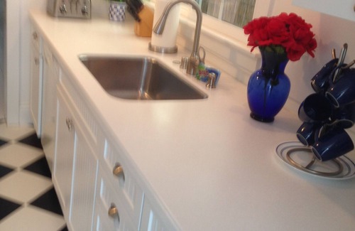 Newer fully equipped gourmet kitchen that would please any chef with newer appliances, new bead board cabinets, corian counters, new lighting and new flooring.