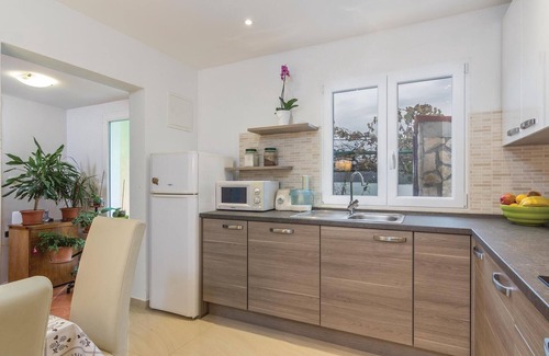 This semi-detached house is located in the small village of Trget, just a few metres from the sea. The holiday home is simply and functionally furnished, with everything you need for a comfortable holiday. The ground floor consists of a kitchen, living room and bathroom. There are three bedrooms on the upper floor. In front of the house there is a terrace where you can enjoy the scent of the sea and Mediterranean plants in the shade of the vine. There is a beautiful pebble beach near the house, ideal for families with children. Trget is a small fishing village in the bay of Raa. Here you will find the ruins of the Romanesque church of St George and numerous restaurants offering a wide range of fish specialities.