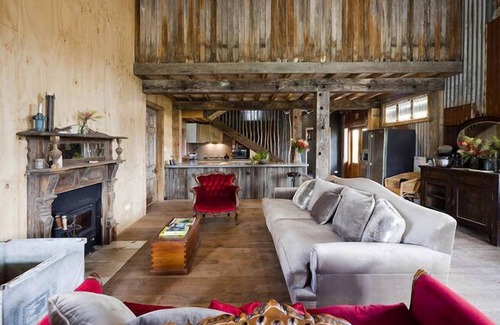 Entering into The Shed via beautiful vintage doors you find yourself in a large living area that includes a rustic fire place surrounded by comfy lounges and chairs, an 8 seater farmhouse dining table and fully equipped kitchen including a large stove and oven.