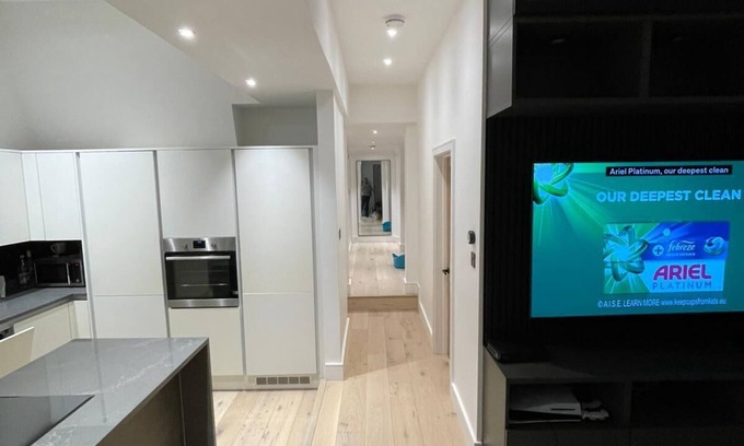 Set within a charming period property, this newly refurbished three-bedroom ground-floor flat offers a bright and spacious living environment. The modern kitchen comes fully equipped with state-of-the-art appliances, while underfloor heating ensures comfort throughout. The inviting lounge features a large L-shaped sofa, complemented by smart TVs and super-fast broadband for entertainment and connectivity.