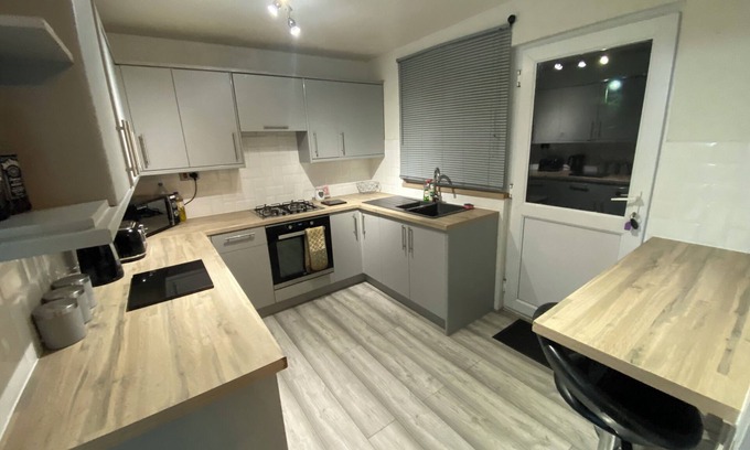 Enjoy a stylish stay in this modernized home featuring a king bed, two doubles, and TVs in rooms.A brand-new kitchen features a cooker, fridge, dishwasher, and washing machine, while the private driveway offers hassle-free parking. Relax in two secluded gardens or explore nearby shops, fast food, and scenic walking trails. Well-behaved pets may be allowed upon request. Fully kitted floor beds can be arranged to sleep 8 too! Book your stay today!
