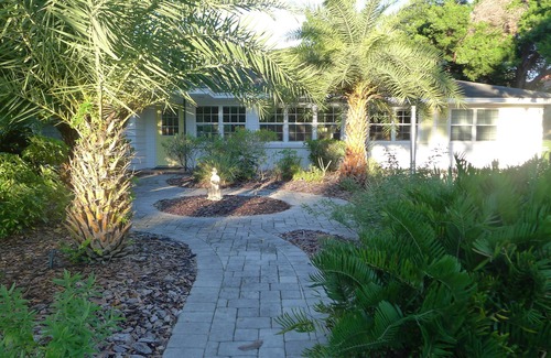 With ample parking available in the shell-covered driveway, this charming cottage is surrounded by Selby Garden-esque landscaping, complete with winding walkways and secret alcoves perfect for meditating or reading a book in a serene nature nook.