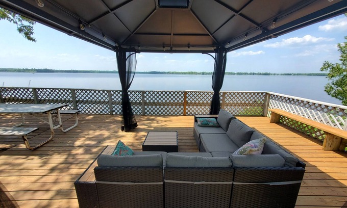 Outdoors we have a 40ft aluminum dock for your boat and other watercraft with amazing fishing right off the dock! There is a massive waterfront deck with a BBQ for you to cook your favorite foods. We will have a canoe, kayak and float toys for the kids to enjoy your own personal waterfront. The water is walk in, no seaweed, sandy/gravel but water shoes recommended for the kids. A great spot for swimming! Approx. 5 ft deep at the end of the dock. Large fire pit with lots of seating for you to enjoy a warm night fire and s'mores. This is a double lot property with 120ft of waterfront to enjoy (larger than most properties in the area).