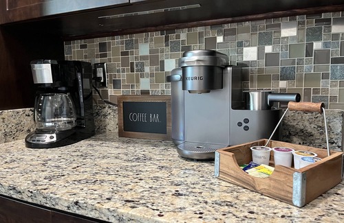The Kitchen - Equipped with refrigerator, microwave, dish washer, coffee maker, keurig machine, toaster, blender along with other kitchen essentials (pots, pans, utensils, dinnerware, etc.)